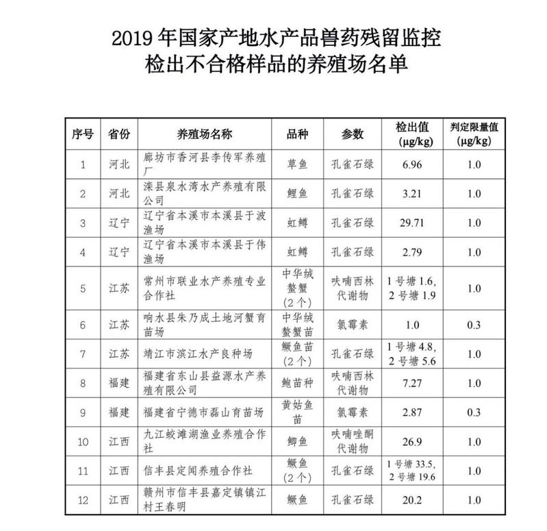 农业农村部发布2019年国家产地水产品兽药残留监控情况