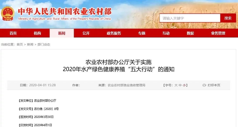 农业农村部4月1日发布,为加快推进水产养殖业绿色发展,促进产业转型升级,农业农村部决定从2020年起实施水产绿色健康养殖“五大行动”。