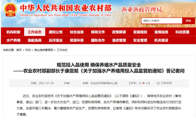 近日,农业农村部发布《关于加强水产养殖用投入品监管的通知》(以下简称《通知》),指导地方农业农村(畜牧兽医、渔业)部门,进一步加大对生产、进口、经营和使用假、劣水产养殖用兽药、饲料和饲料添加剂等违法行为的打击力度,全面开展三年整治,着力整顿相关产品生产、经营和使用秩序。记者就《通知》有关问题采访了农业农村部副部长于康震。